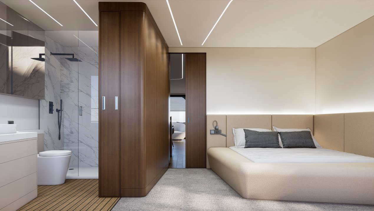 The interior configuration of Minoa 200 allows for multiple full-size owner and guest cabins, supported by dedicated crew quarters, enabling smooth operation while maintaining complete privacy in living areas. Expansive saloons, increased ceiling heights, and large glazing surfaces create a bright, open atmosphere that feels permanent rather than temporary. With clearly separated technical zones, residential-scale circulation, and systems designed for long-term use, Minoa 200 is not a traditional yacht — it is a floating living environment built for real life on water.